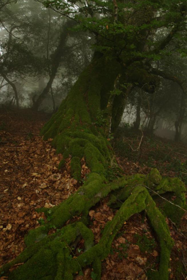Es muy fácil encontrar en picos hayas bastantes grandes con sus grandes raíces fuera de la tierra y dan la sensación de que se aferran a la tierra como si pareciese que se fueran a caer.