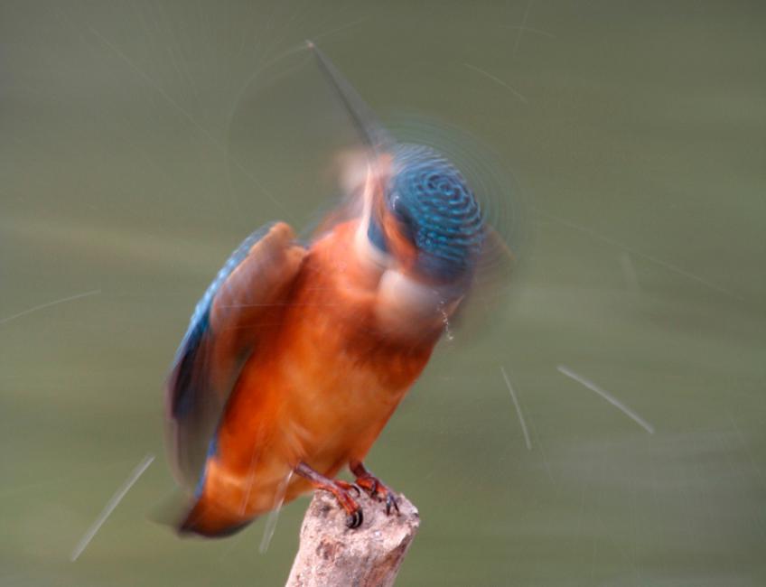 Este macho de martín pescador se quita el agua después de comerse un pececillo, la baja velocidad de obturación ha logrado congelar el movimiento lo suficiente para ver el desplazamiento de las gotas de agua y también para poder observar el espectacular giro de cuello que tienen estas aves.