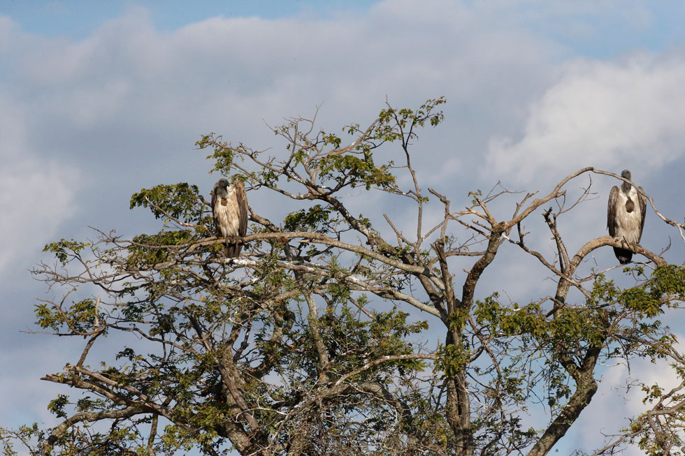 Unos buitres moteados observan desde lo alto de un árbol, y como se puede ver tienen el buche lleno.