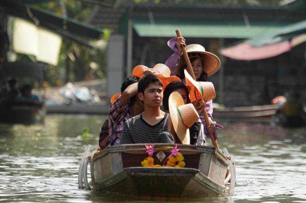 Una familia se desplaza en barca  en el mercado flotante, evidentemente en este mercado hay que regatear.