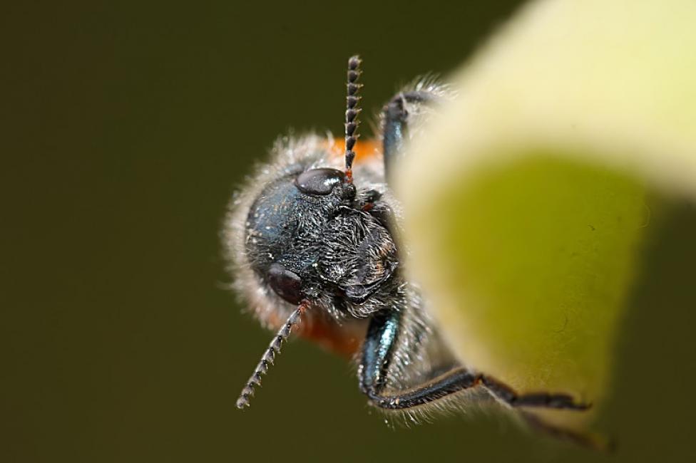 Este crisomélido, probablemente, Lachnaia sexpunctata se mueve por el "filo de la hoja", lo que permitió obtener un primer plano de la cabeza que contrasta perfectamente contra ese fondo verde.