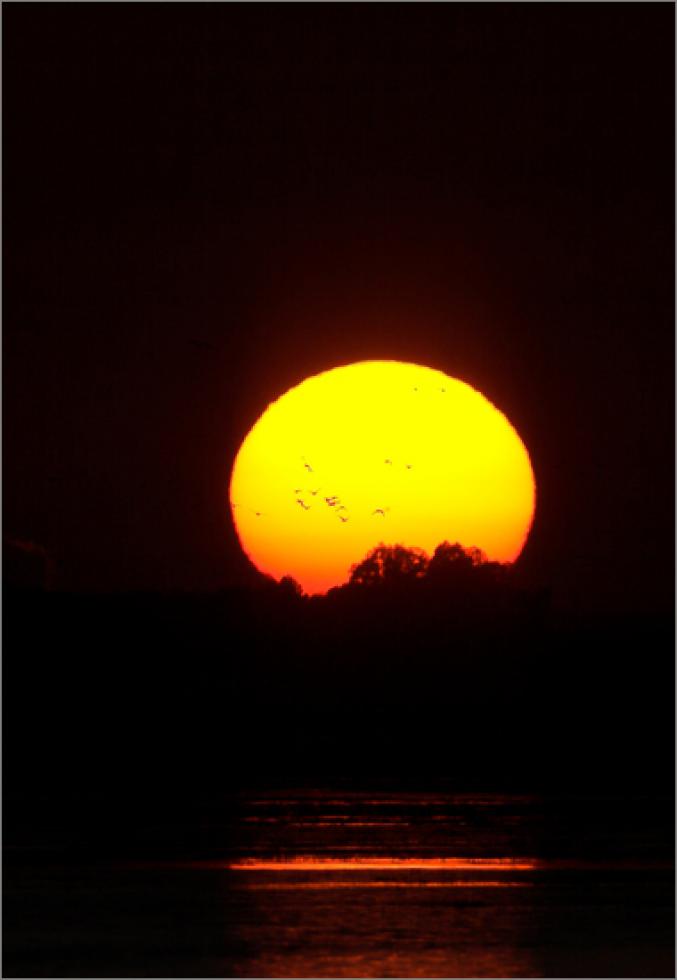 Otro ocaso en este caso sobre negro, realizada en un invierno en el Parque Nacional de Doñana, el sol es cruzado por aves camino de sus dormideros.